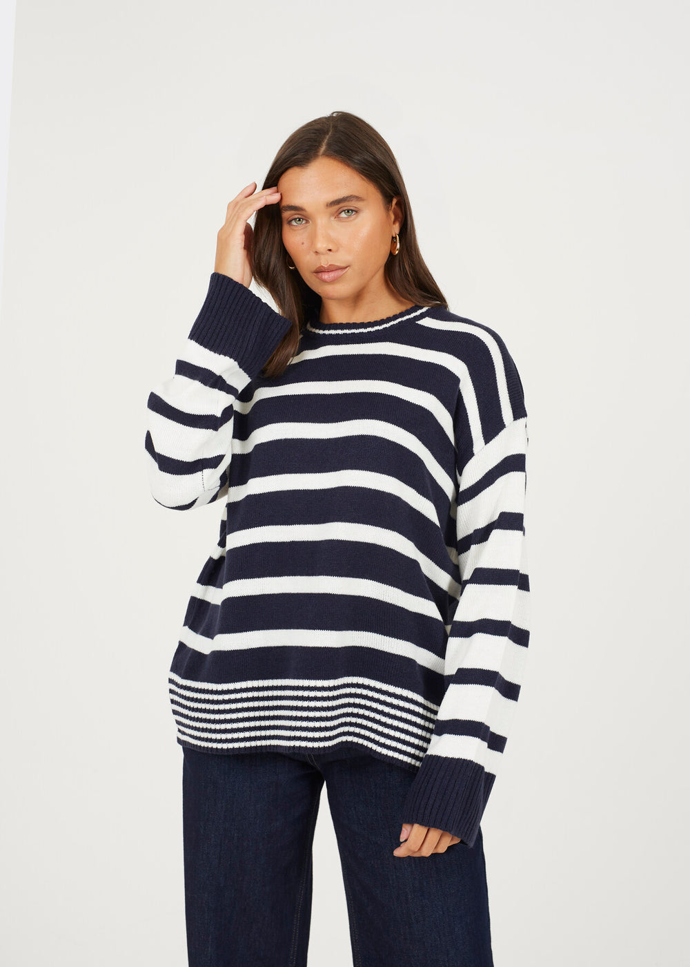 STRIPE CREW NECK TUNIC JUMPER, CREAM AND NAVY
